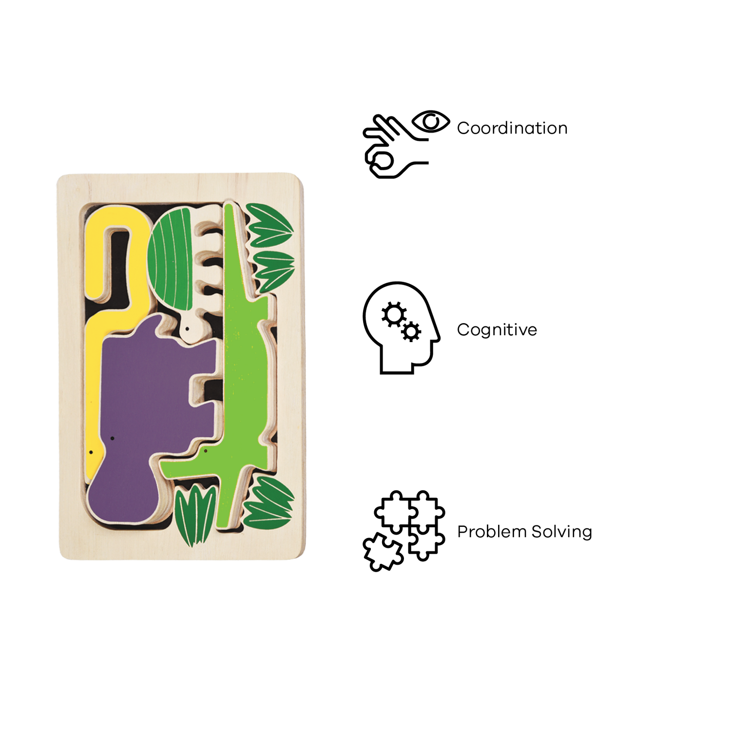 Hippo, Turtle, Alligator, and Snake are explored by examining and drawing a distinction between the different shapes. Put all pieces onto the tray to complete the picture puzzle of Amazon jungle. They can also be used individually as story telling tools.