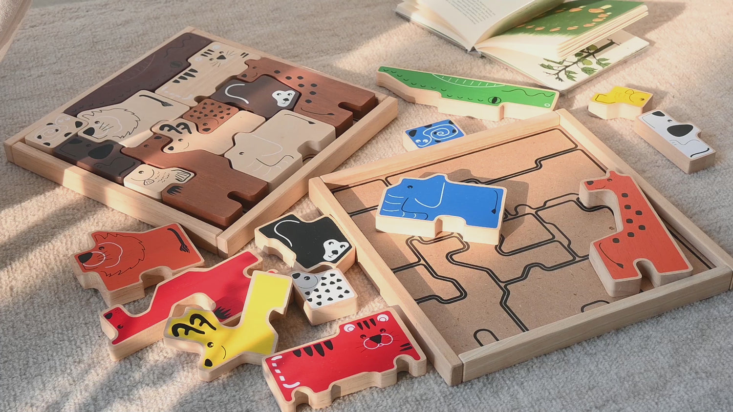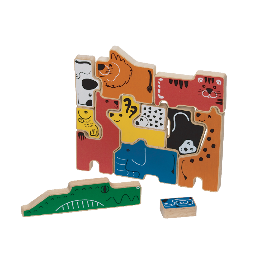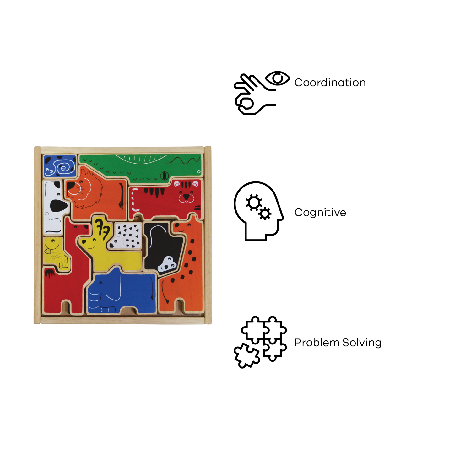 Twelve various animals are fitted into their designated position on the tray. This is a fun and challenging puzzle which also provides imagination. The animal blocks can be used for story telling and naming.