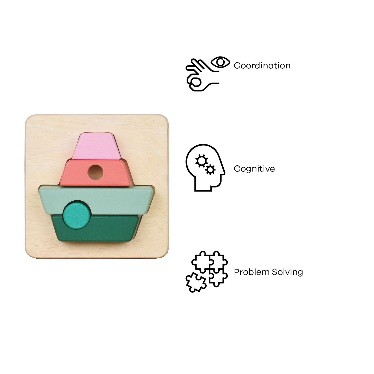 This Boat Tray Puzzle contains large block pieces that are great for early child's eye-hand development. Putting the pieces back onto the tray to discover a boat or use those pieces as building blocks to create other imaginative figures.
