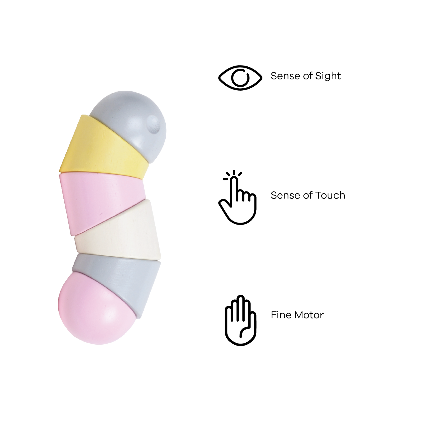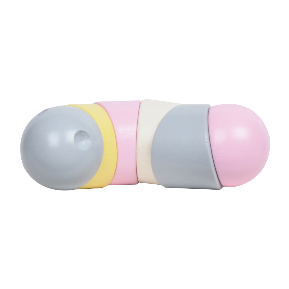 Our rattle series are playful mixes of natural wood and colours. Each one has their own playful characters which makes different sounds and offers different tactilities. The grasping sizes are great for small hands and mouth.