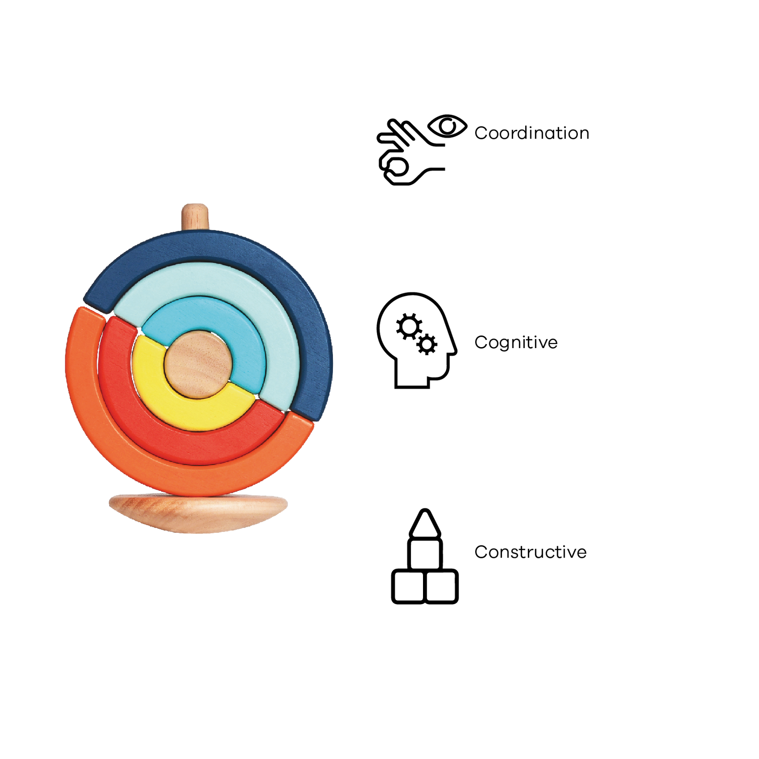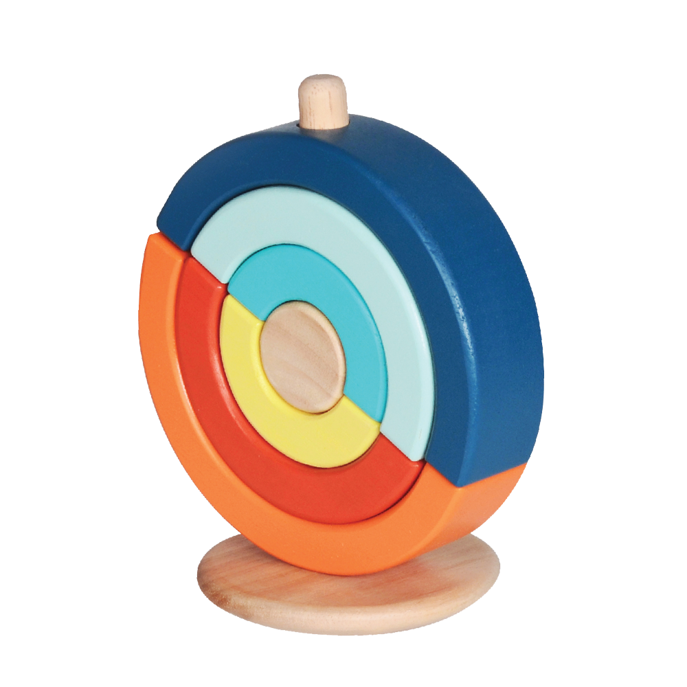 Put back as many of the half-circle pieces onto the rod as you can. The half-circle pieces come in graduated sizes that easy to recognize weight and to balance. Helps develop fine motor skills, and turn-taking.