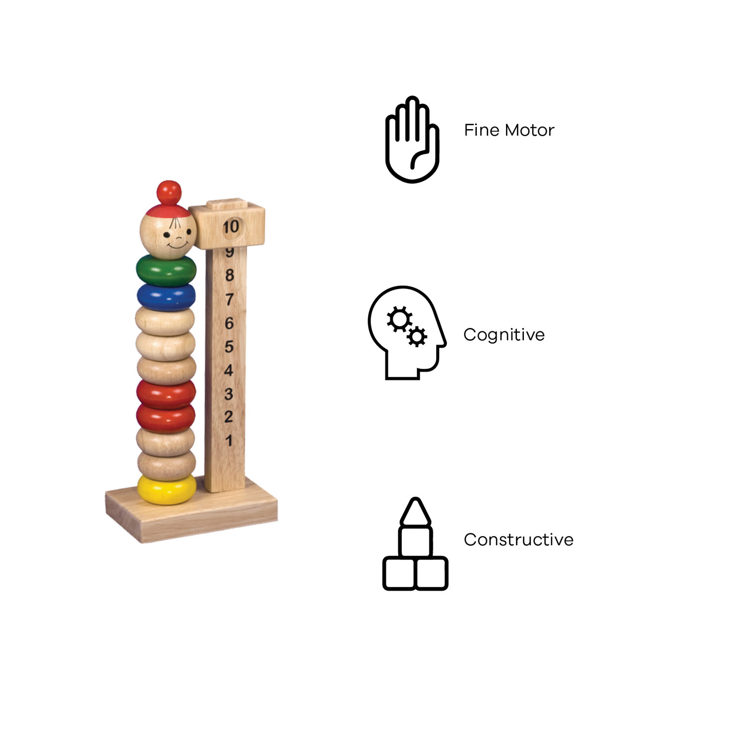 Piles the rings and caps them with the clown's head to read the resulting number.