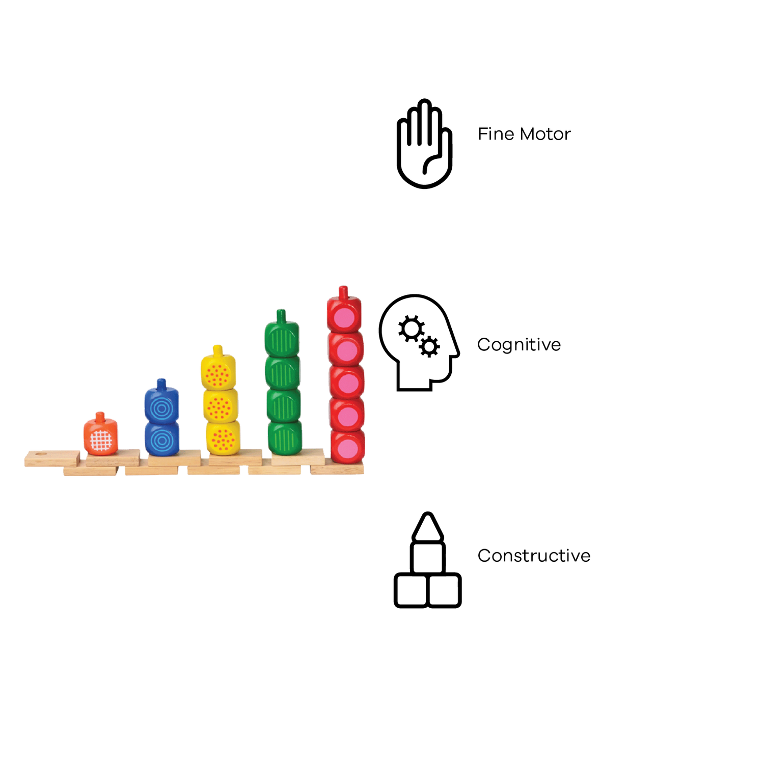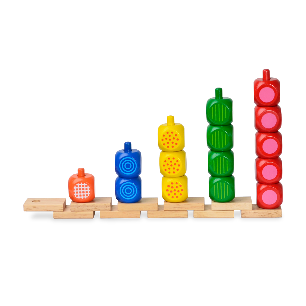 Colorful cubes to be counted and placed onto corresponding color rods. Each rod stand separate and can be linked as a series. Helps promote eye-hand coordination, basic color and math skills.