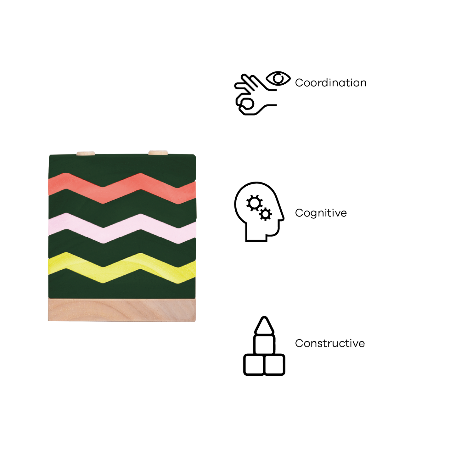 Inspired by zigzag lines representing the continuous movement of seawater. The sharp turns and angles characterize the nature of current that flow in great distances from one direction to another, interacting with another currents. Without having to understand the meanings behind the names, children can enjoy creating different height of currents on the rods as well as creating other combinations on the table.