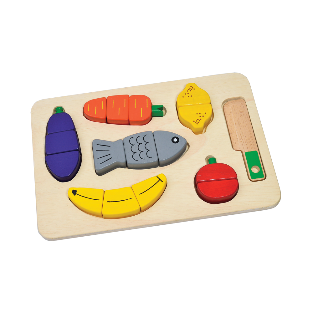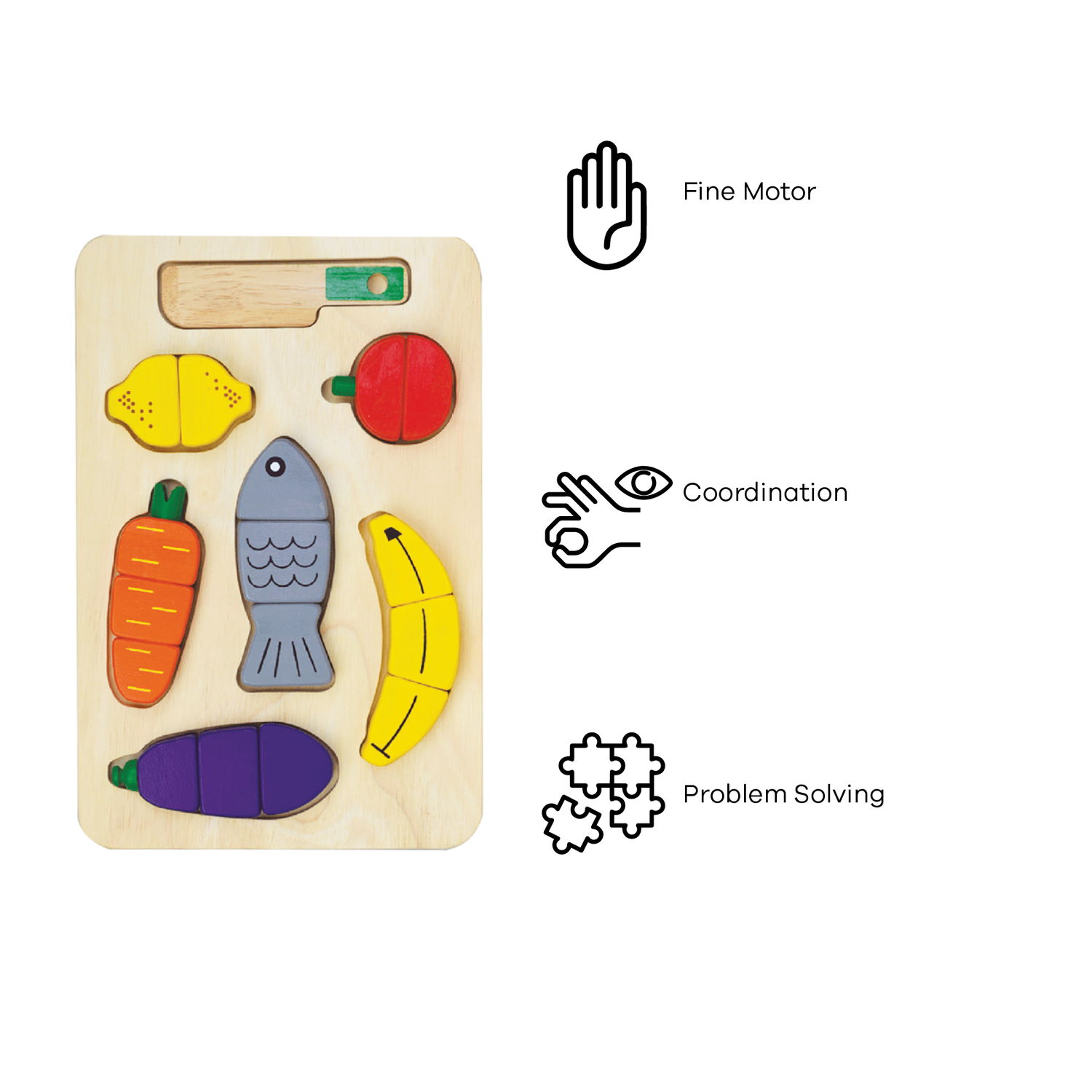 As children start to develop their recognition to everyday's objects, it is fun to first introduces them to food through shape sorting. This classic game is great for developing eye-hand coordination, problem solving, and teaches patience.