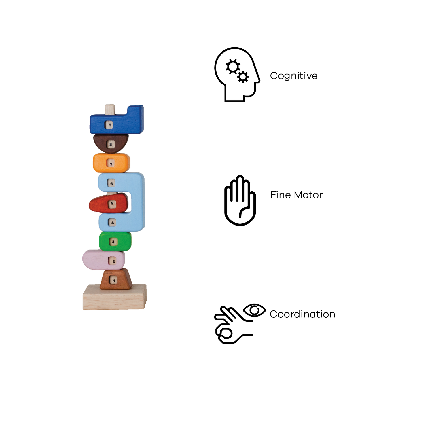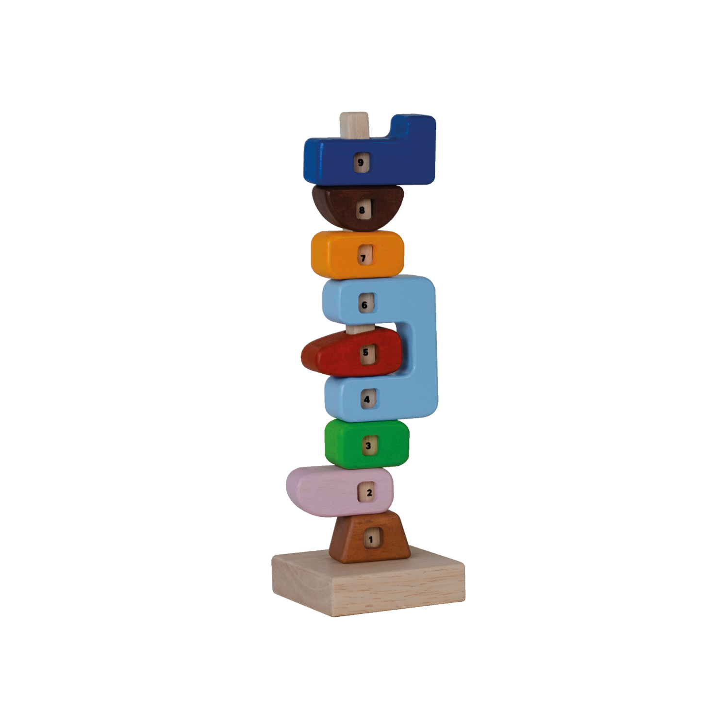 Encourage early mathematical skills using these fun organic elements to count numbers from one to nine. The center cut-outs show the sequencing numbers as the children count along. The elements are inspired by native totems. Each piece can be piled freely creating different totemic configurations.