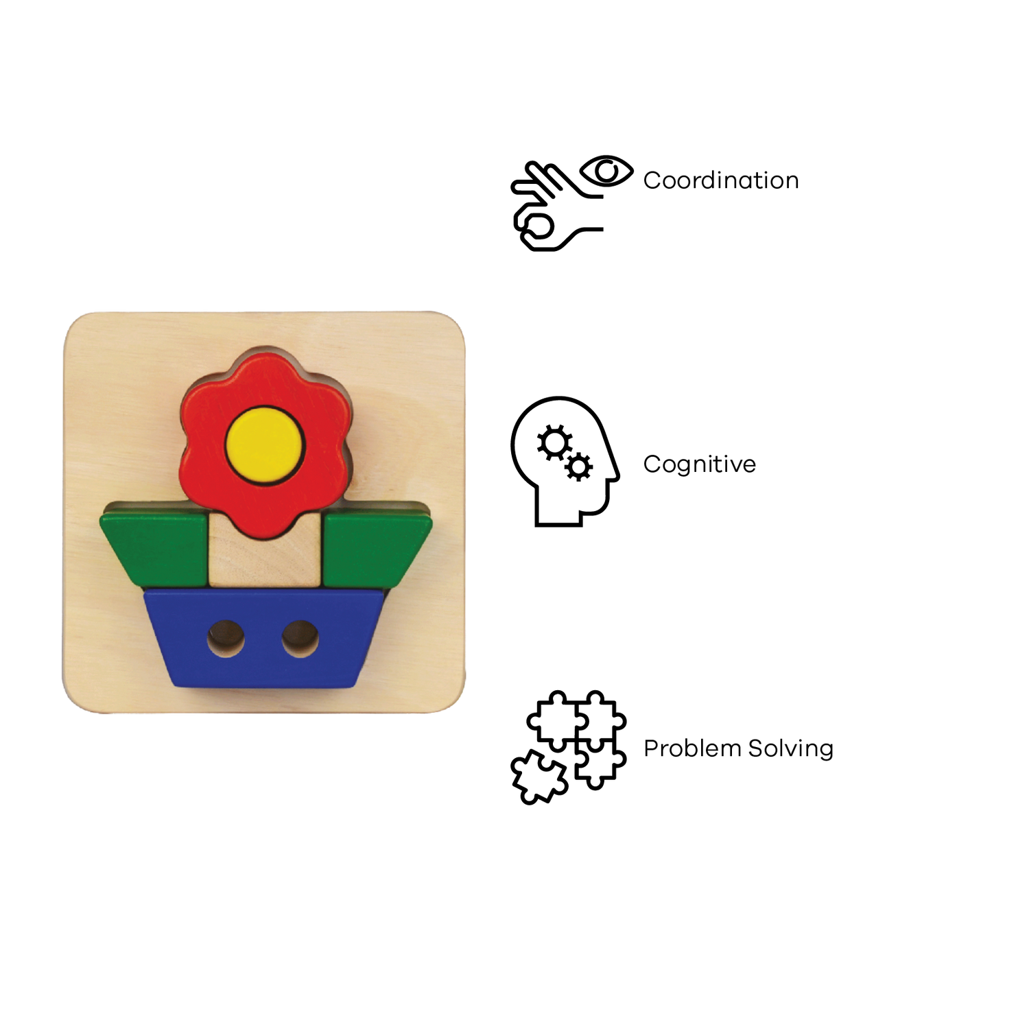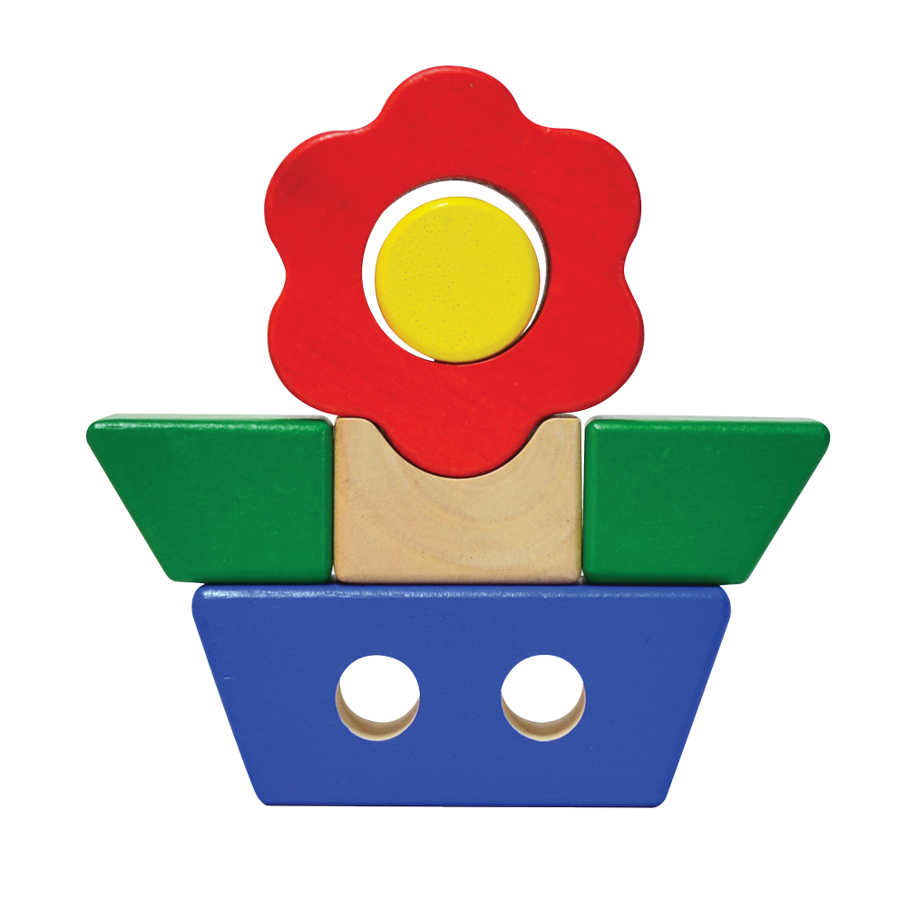 This Flower Tray Puzzle contains large block pieces that are great for early child's eye-hand development. Putting the pieces back onto the tray to discover a flower or use those pieces as building blocks to create other imaginative figures.