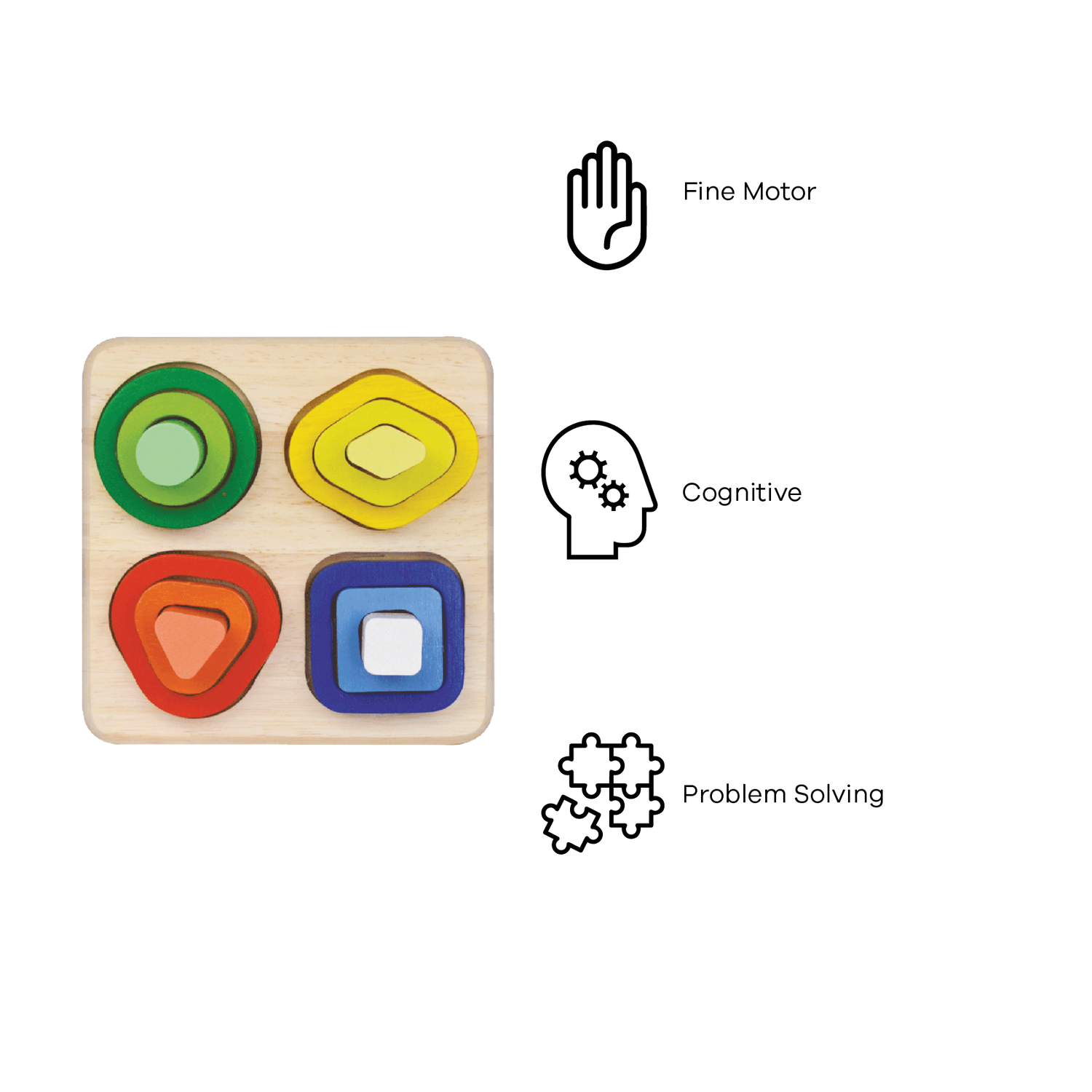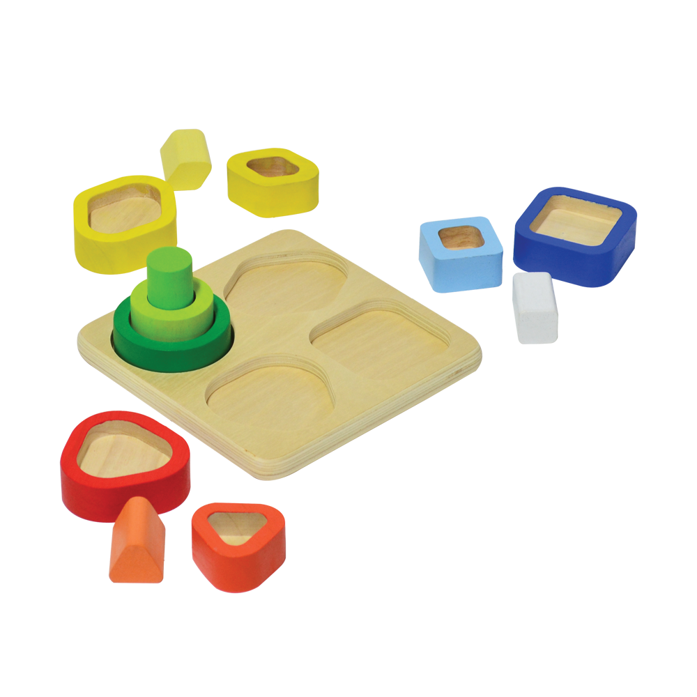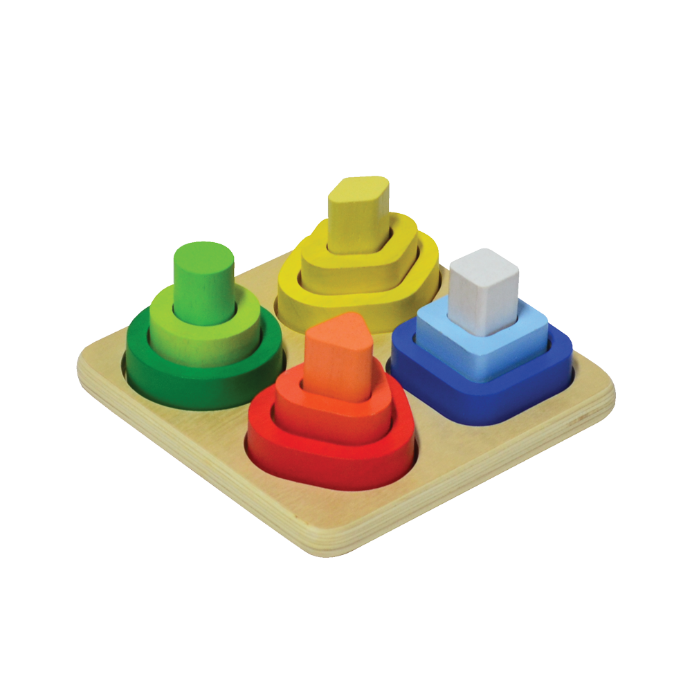Express and explore relative sizes by placing smaller blocks into the associated grooves on larger blocks to configure gradation of sizes and shapes.