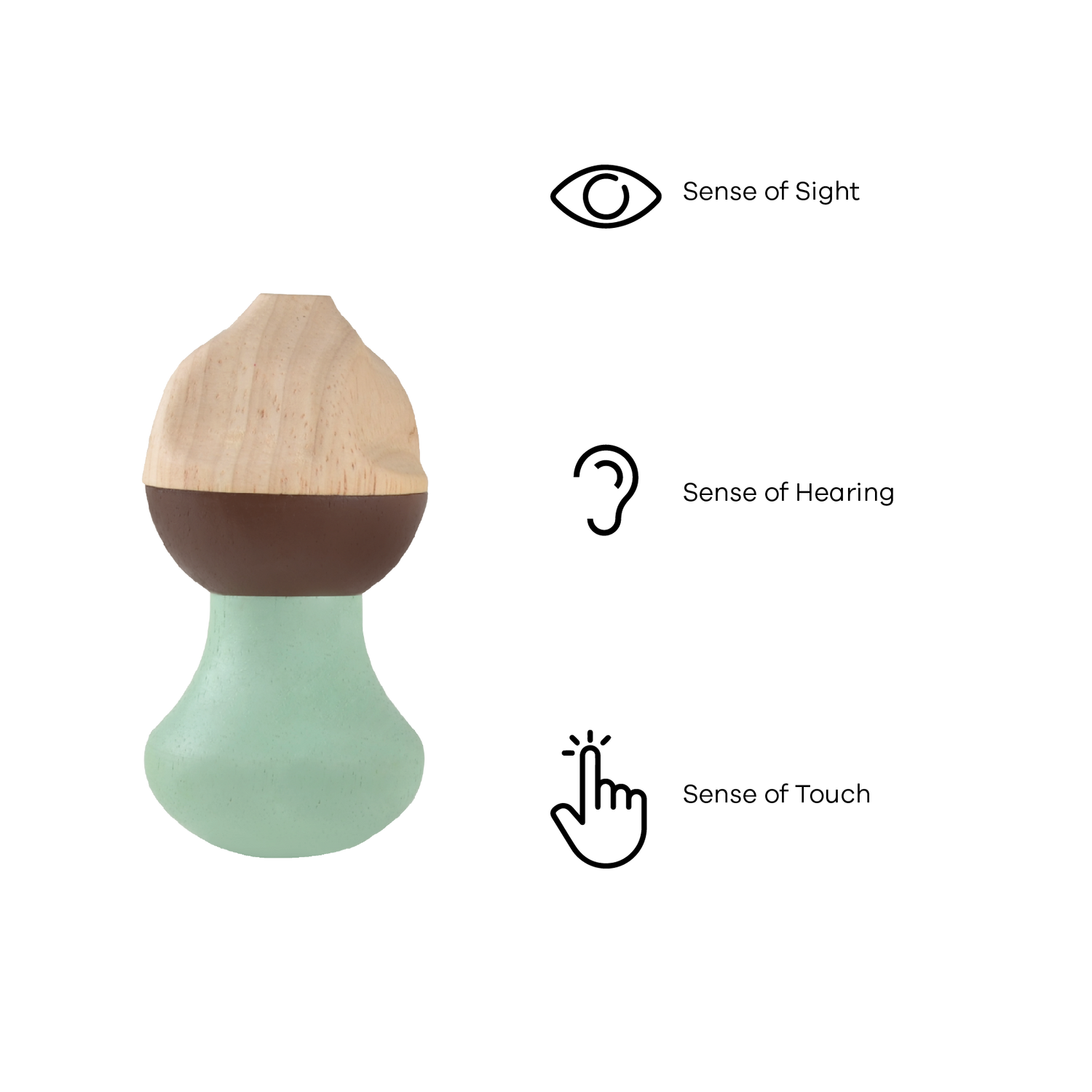 Our rattle series are playful mixes of natural wood and colours. Each one has their own playful characters which makes different sounds and offers different tactilities. The grasping sizes are great for small hands and mouth.