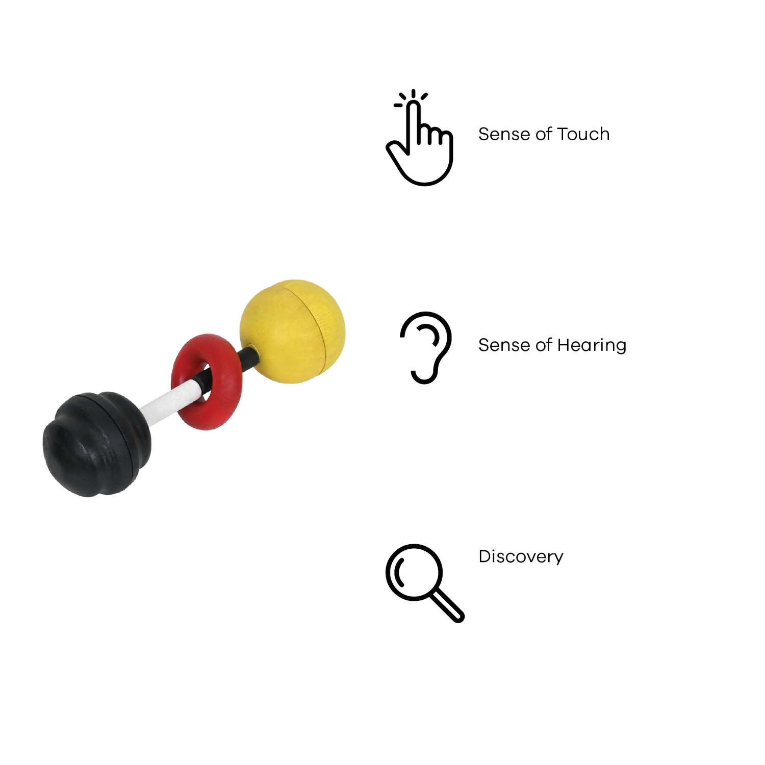 The Maraca Wand is perfect for baby's grip. The flexible stem makes it safe for baby to hit and drop the toy. The two texture balls on both ends have soft rattling sounds of which help develop the sense of touch and hearing.