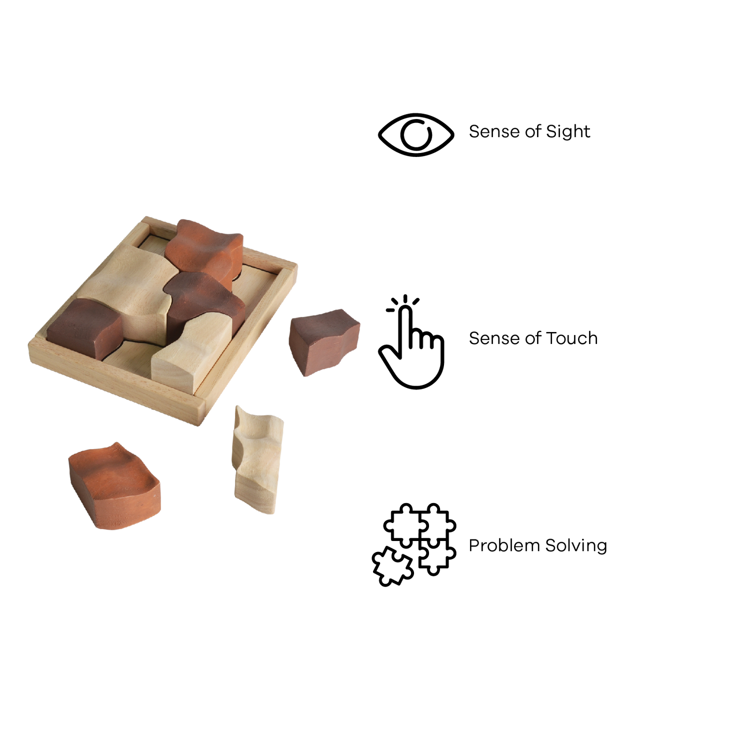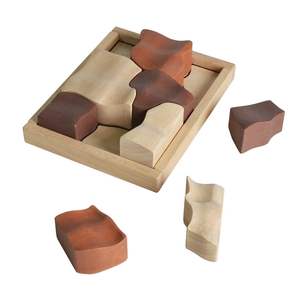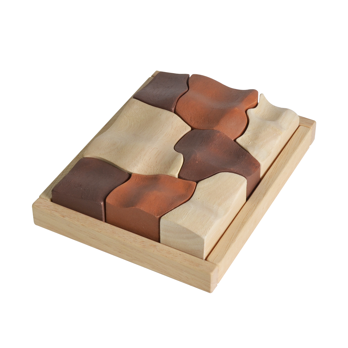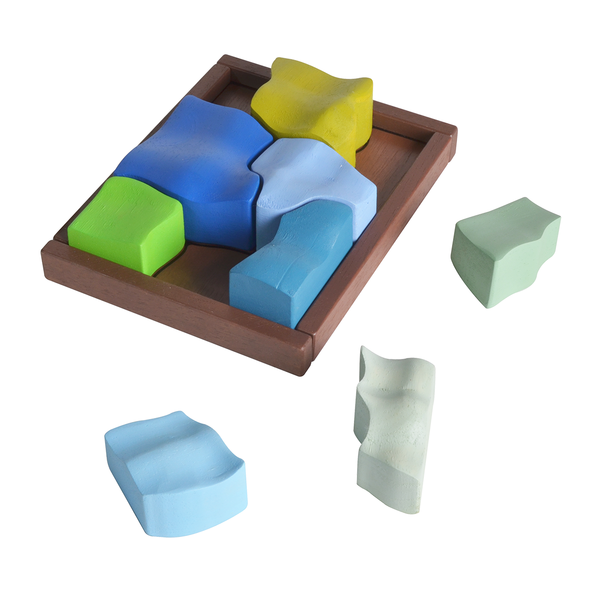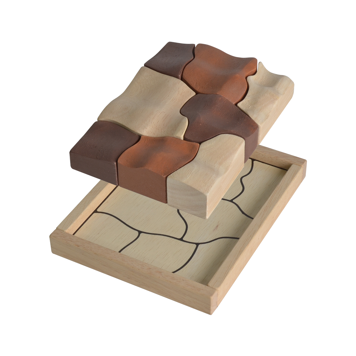 This tray puzzle is inspired by organic shapes and forms in the nature. Outline of the pieces can also be found on the bottom of the board for an easier start. After multiple games, children can try to put the free-form pieces back together into the complete rectangular shape on their own. The game is designed to be visually pleasing and enjoyable for both the children and grownup.