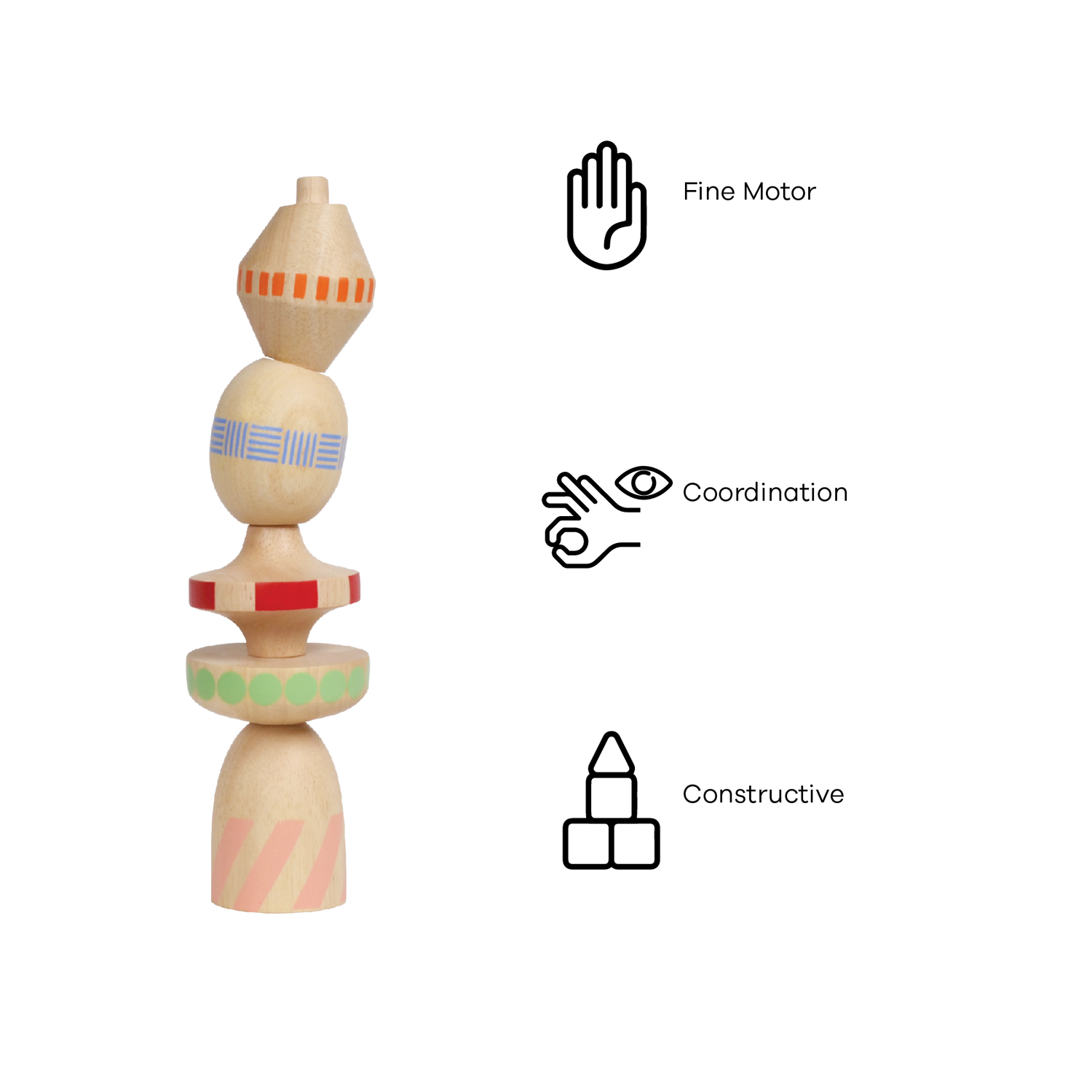Pile the blocks every which way and see how tall is the stack before they come falling down. Featuring 5 revolved blocks of different sizes and weight, this vibrant pattern stacker offers children to tactile and sorting the shapes, and to sorting and stacking. Stacking up the blocks develop balance and coordination skills.