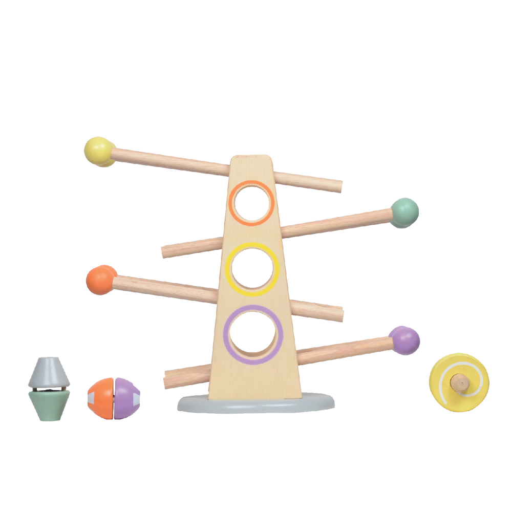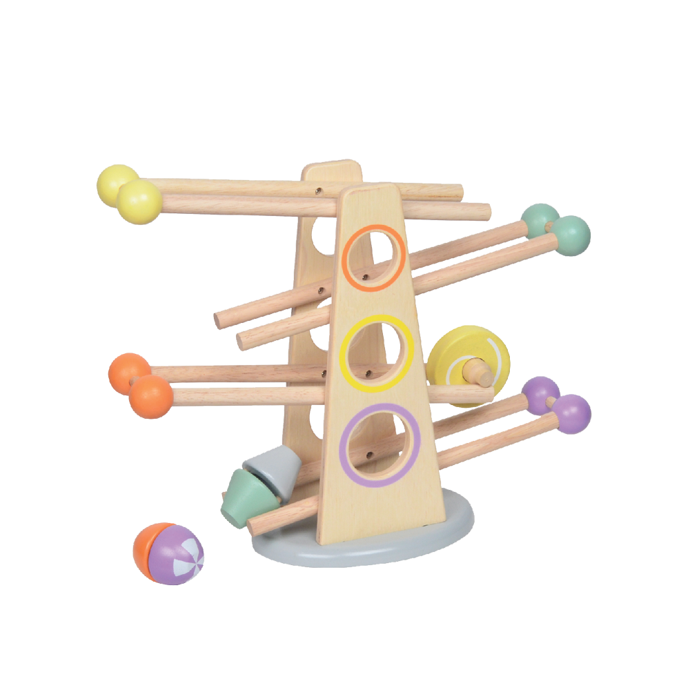 The ball capsule and wheel tumble down with click clack sound on their downward journey. The set come complete with three wooden click clack rollers. The roller ramp requires no assembly.