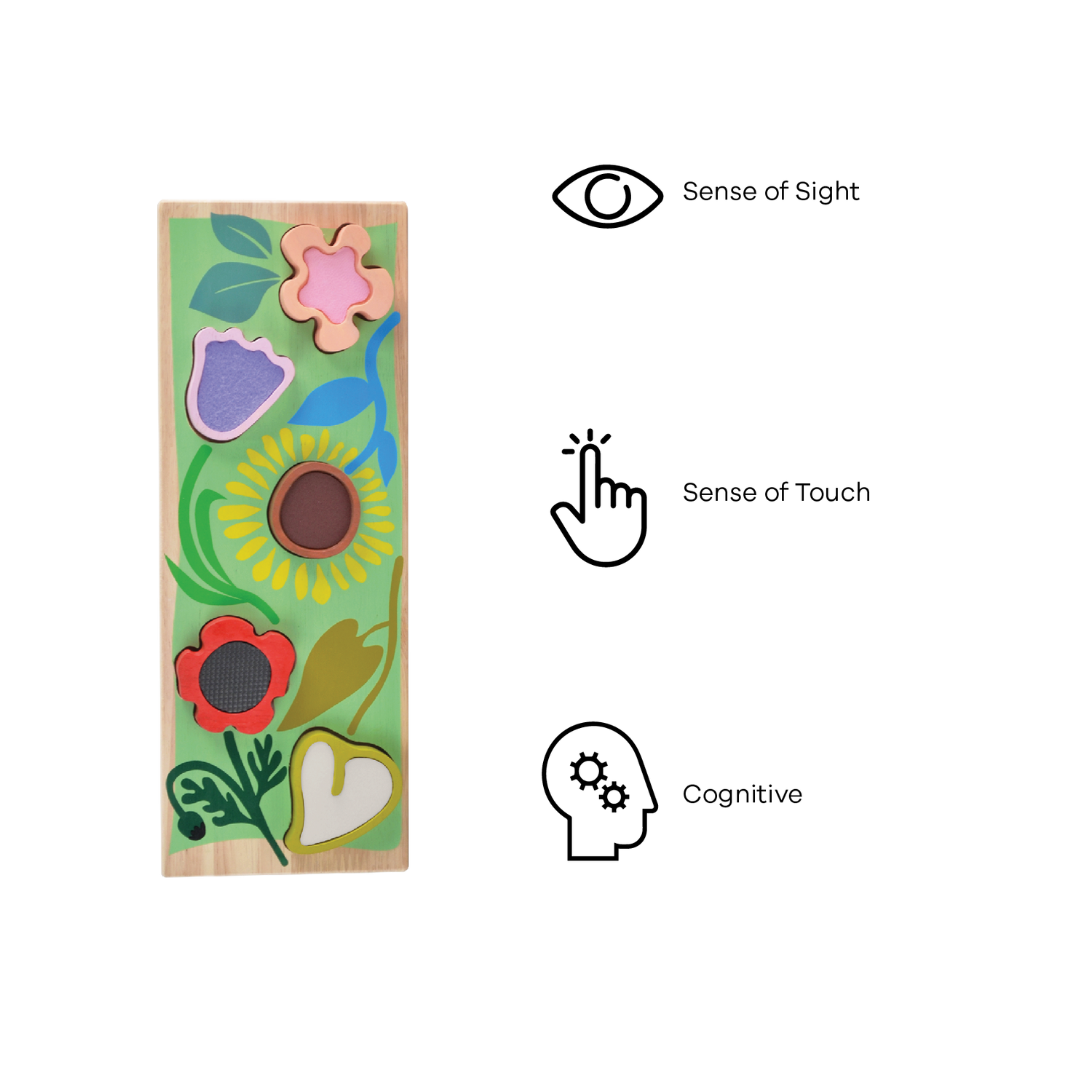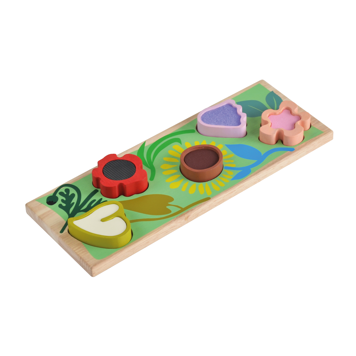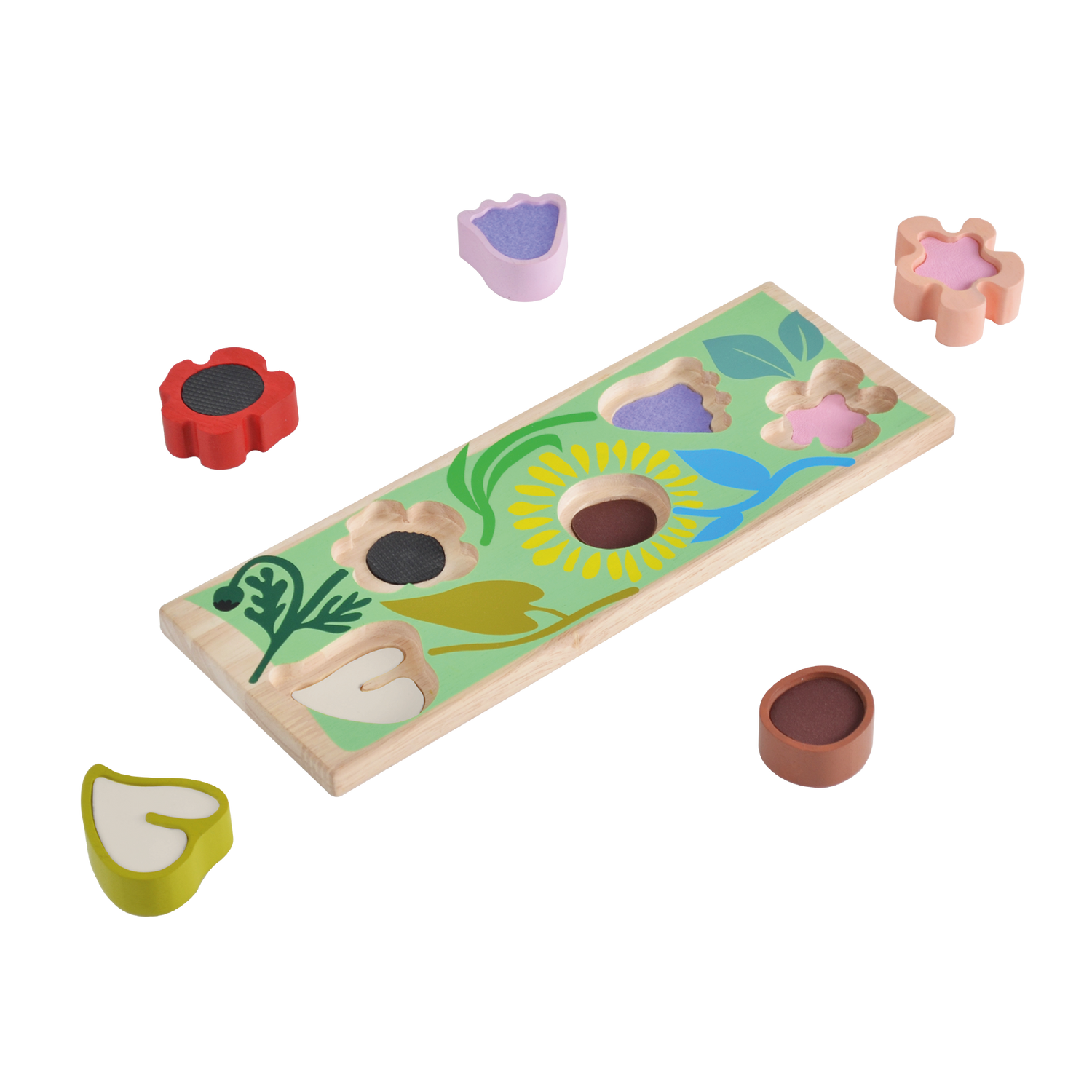 Match textures and shapes of the play pieces to the slots on the illustrated tray. This sensorial puzzle enhances children’s cognitive skills by identifying textures, shapes, and characters. With the wild garden theme, each piece can be played outside or on the tray for story telling as well.