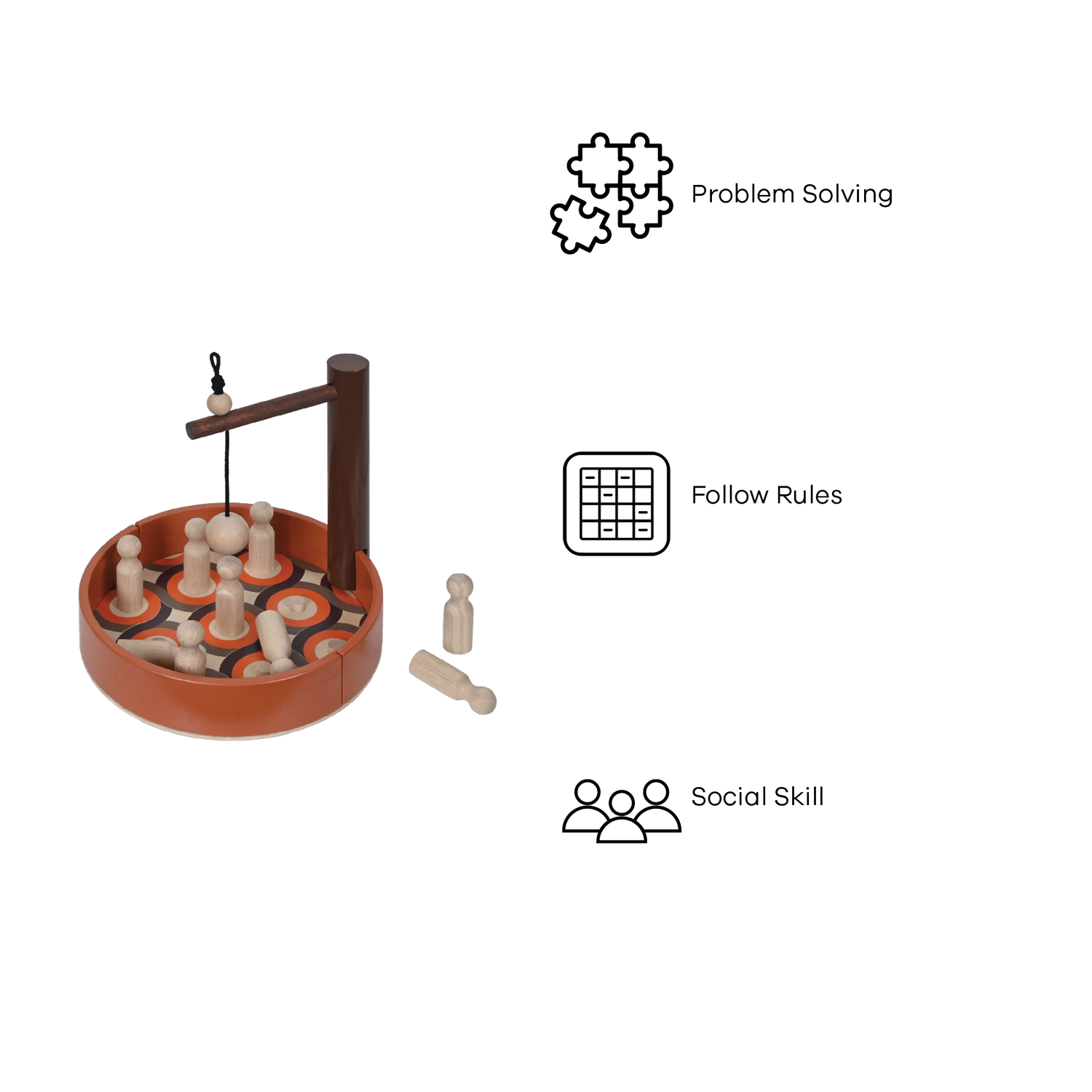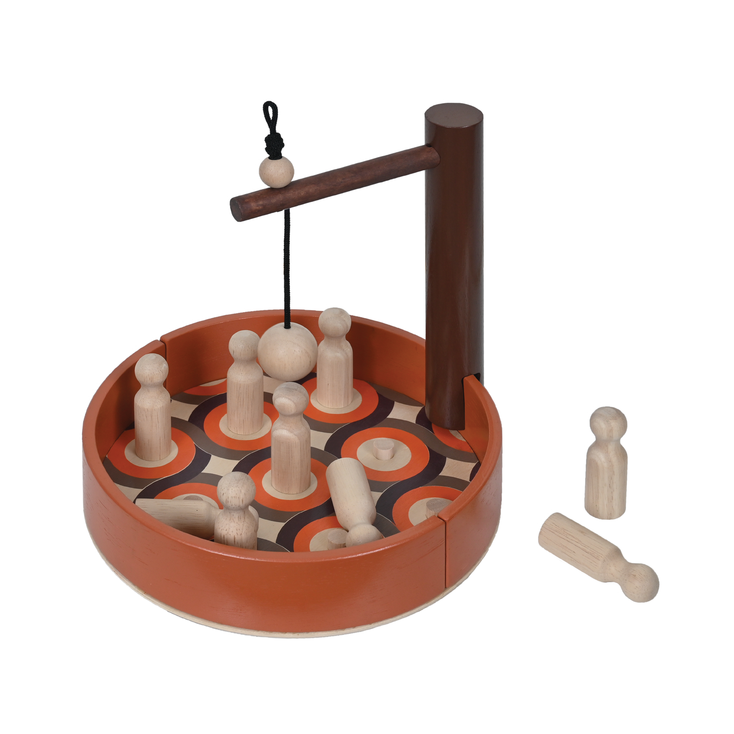 The general object of the game is to use a ball to knock over the skittles. Players swing the ball from either side of the pole and try to knock over as many skittles as possible in three throws. The ball is permitted to go forward and back only once for each throw. The player should catch the ball as it returns, as it can only go once in a throw. Record how many skittles a player has knocked over. The player with the highest score recorded wins!