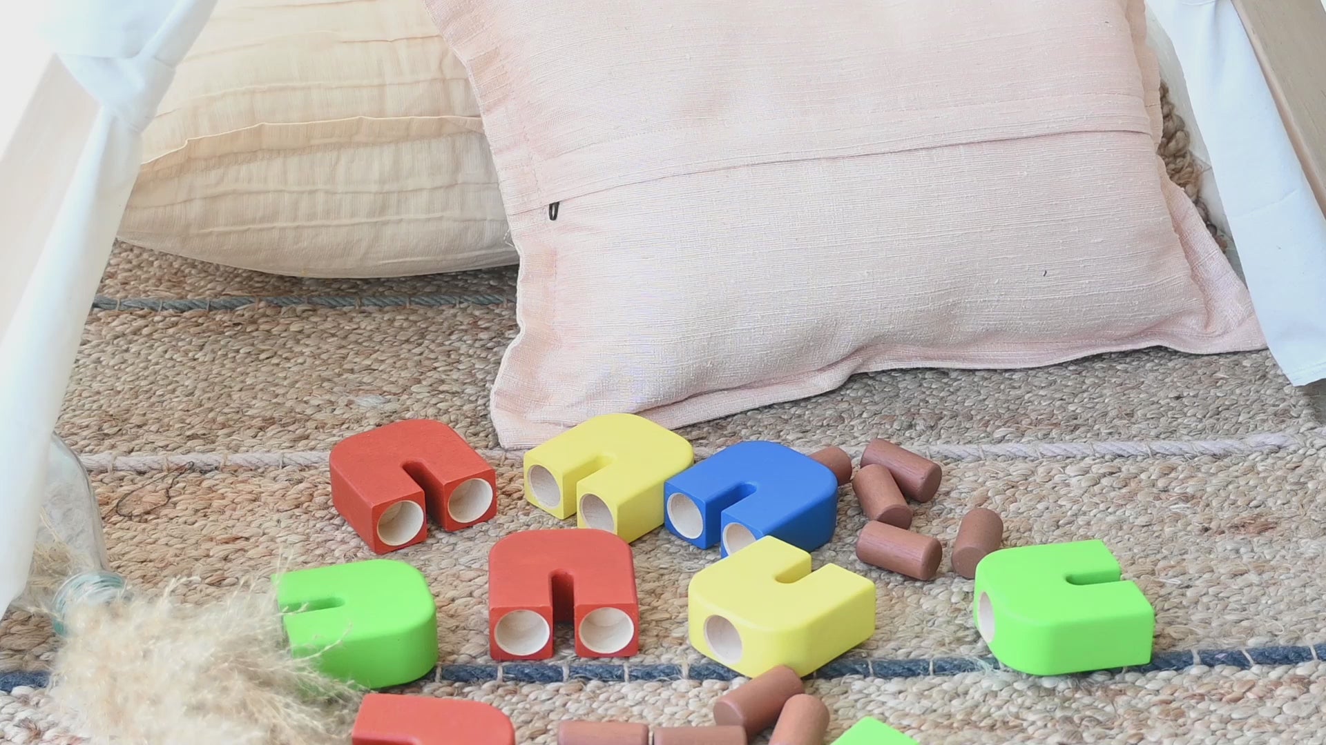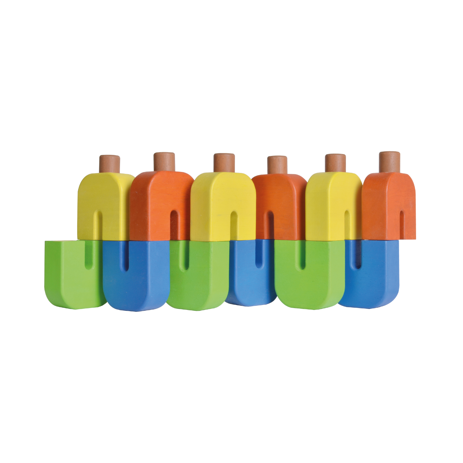 This set of construction toy consist of 12 U shape block and 18 dowels. This may look like a simple module, but you will be surprised how it can create many complex configurations. Children and adults can tirelessly enjoy building linear or tower like structures. The U blocks and dowels come in various colors which give player the opportunity to playfully style their creation.