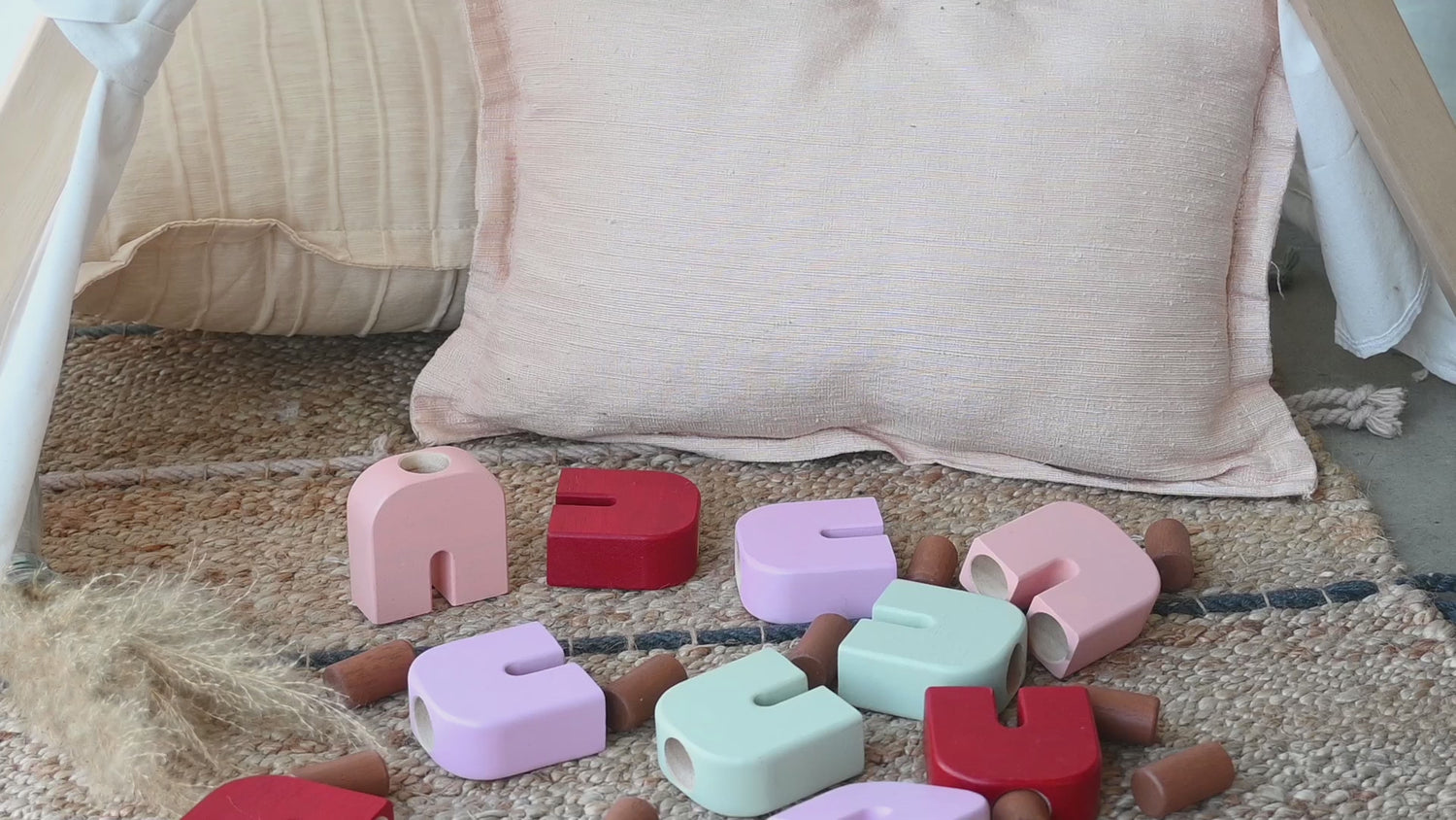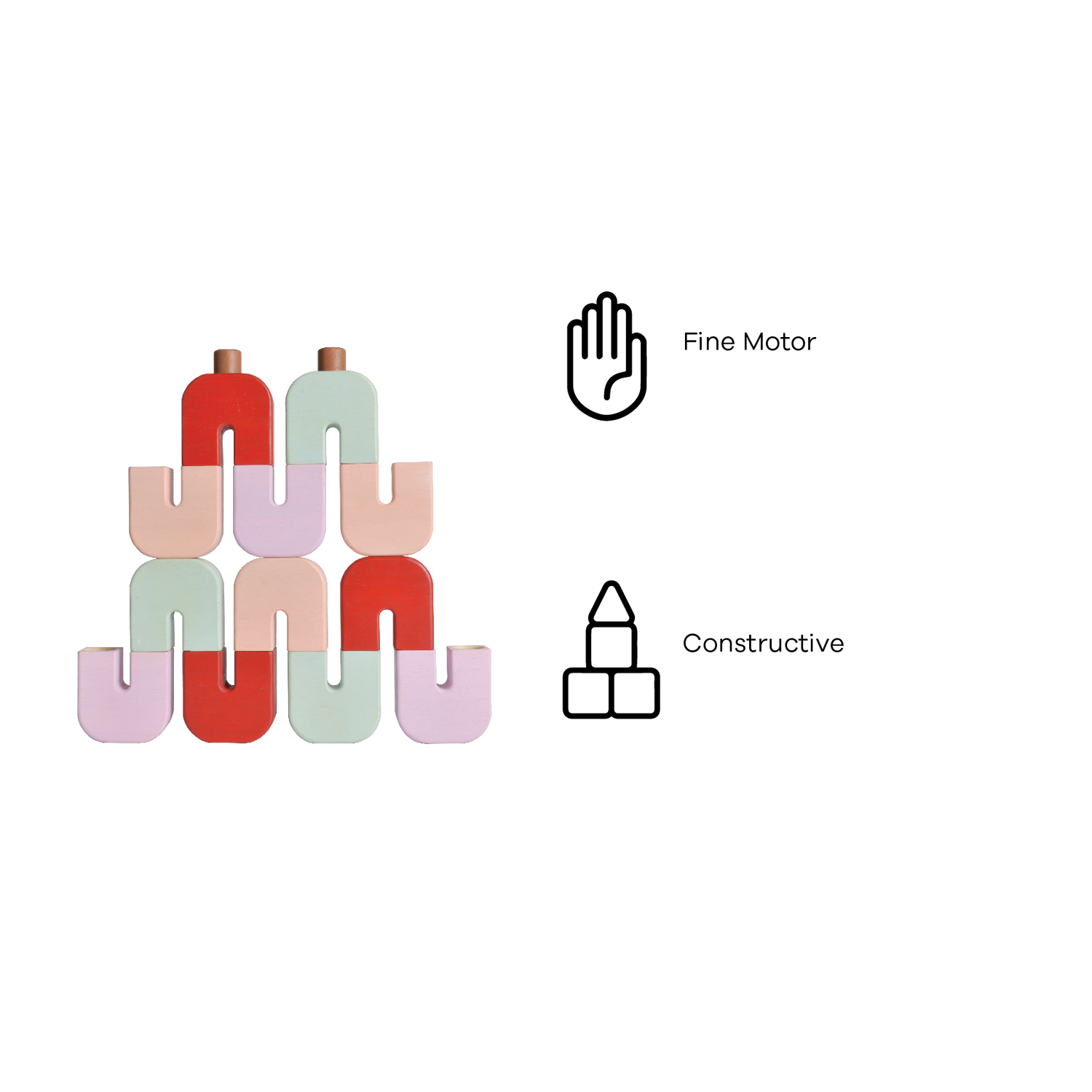 This set of construction toy consist of 12 U shape block and 18 dowels. This may look like a simple module, but you will be surprised how it can create many complex configurations. Children and adults can tirelessly enjoy building linear or tower like structures. The U blocks and dowels come in various colors which give player the opportunity to playfully style their creation.