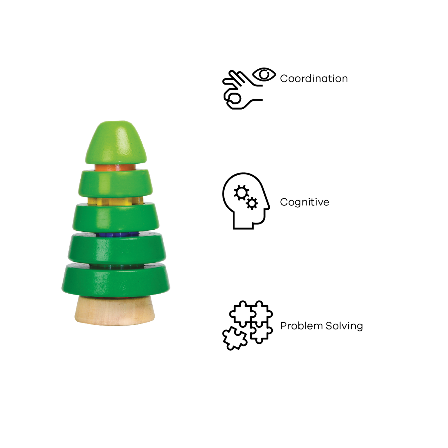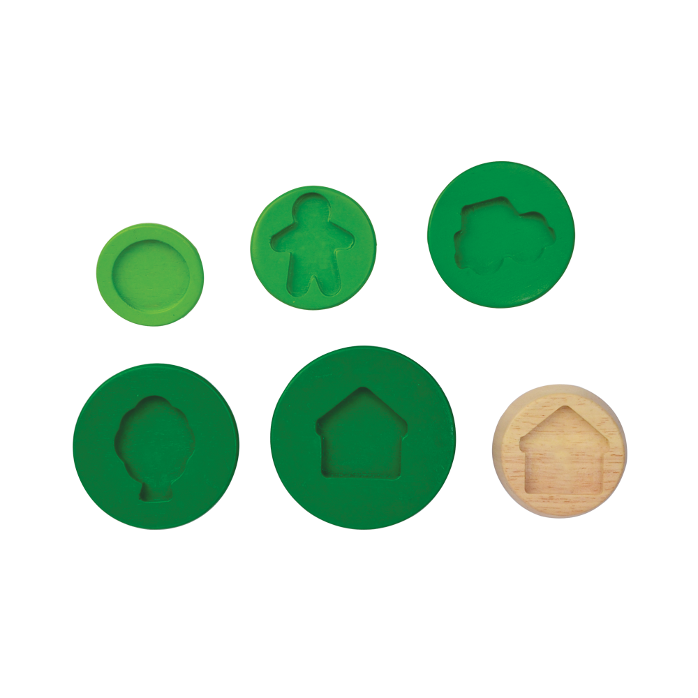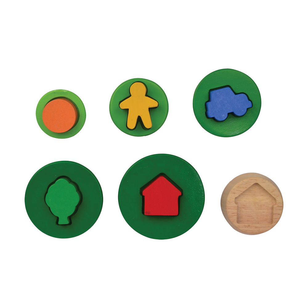 Sort pine is a vertical shape sorting toy with hidden slots in between discs. This toy includes common symbols and shapes that children can learn to name and identify. The pine tree encourage children to solve a problem on their own.