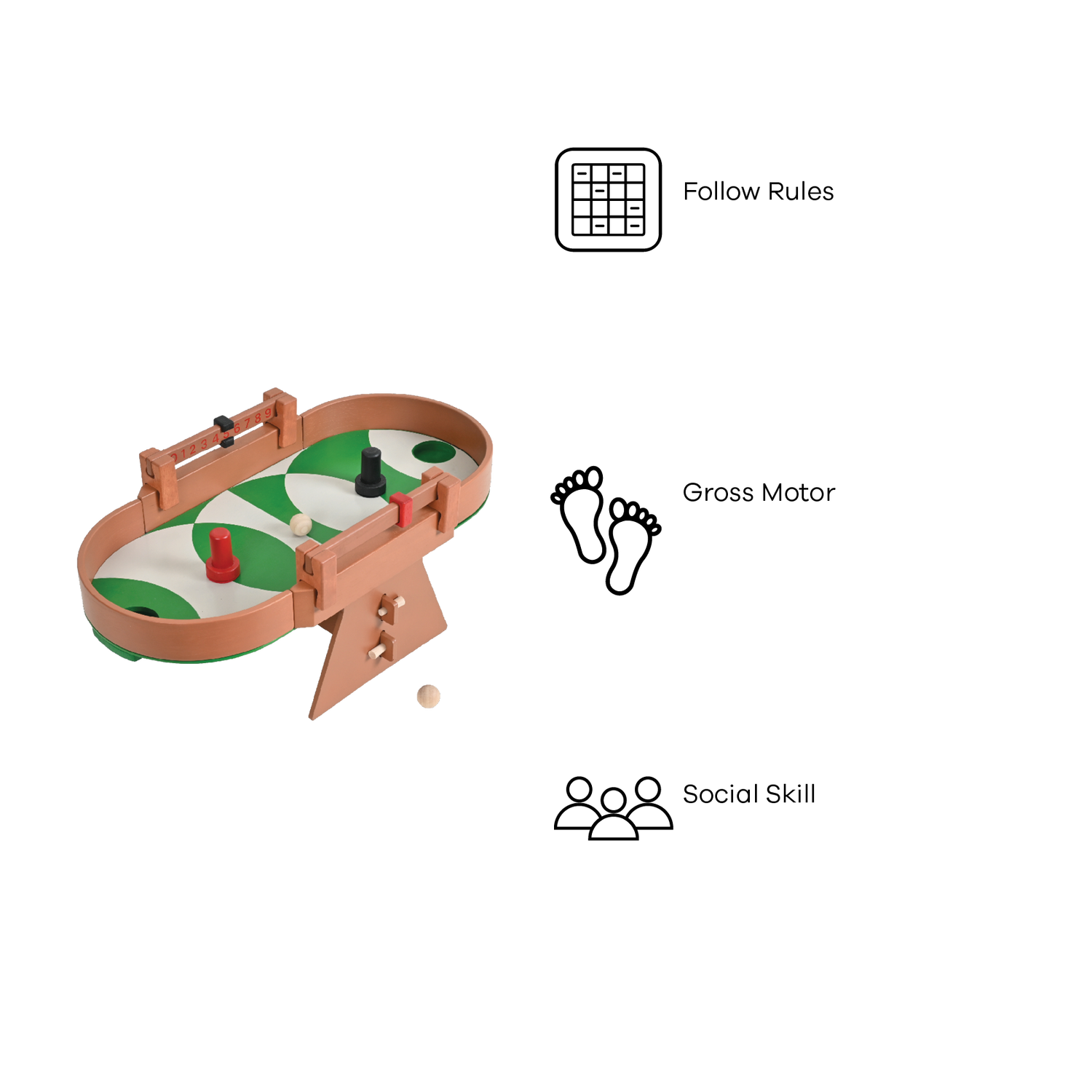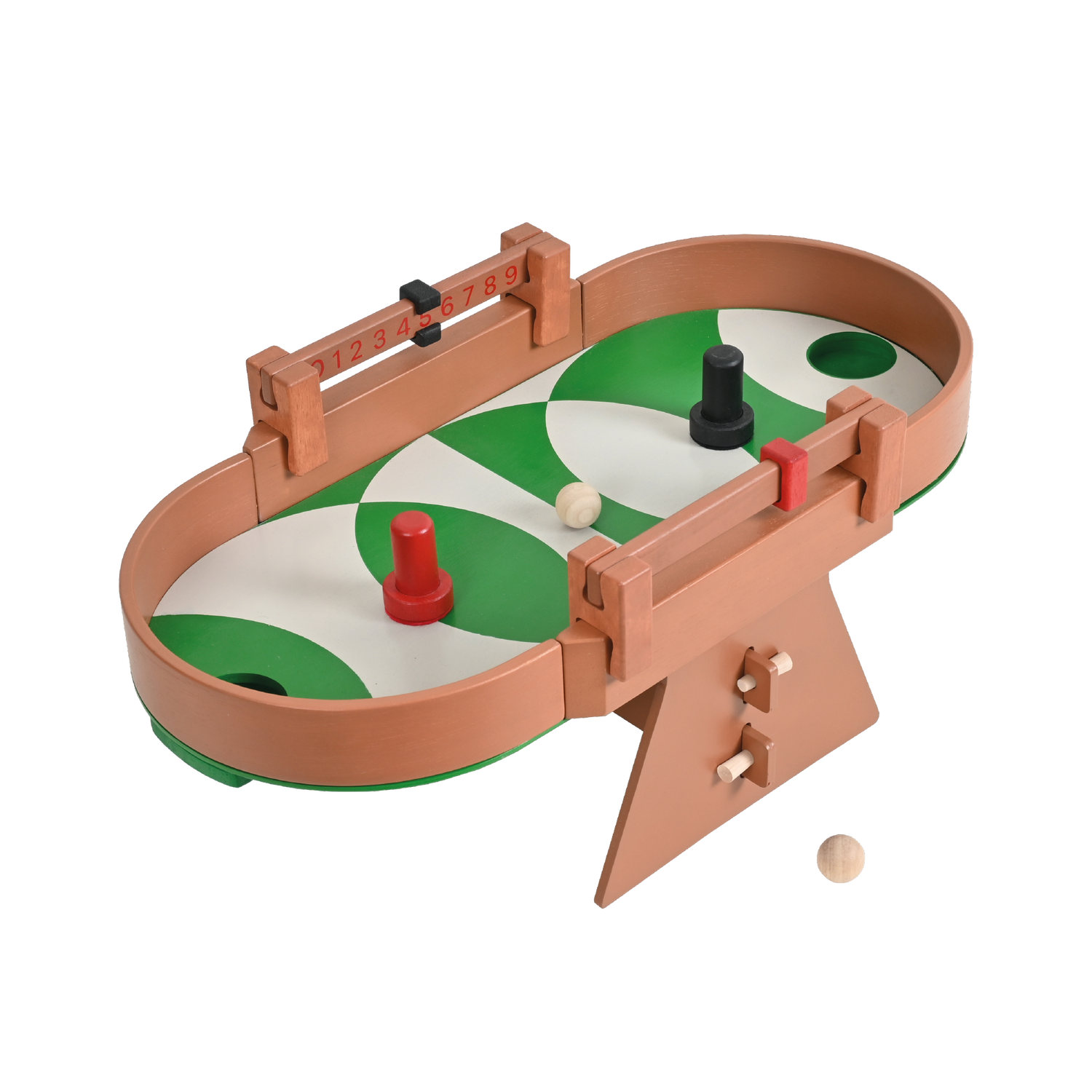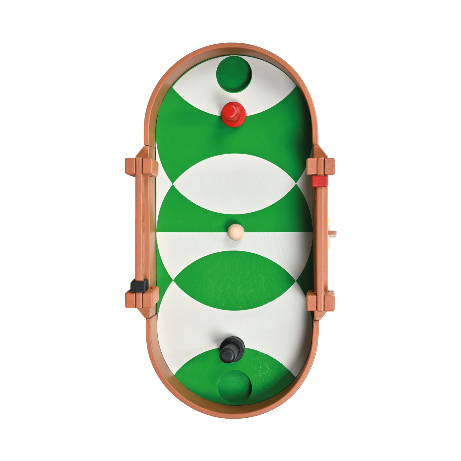 This version of Table Football is inspired by vintage games using muted colors and op-art graphics to indicate the football field. Table Football is non-violent and inter-generational. It is also a physical activity which requires concentration and focus. The aim of the game is to score more goals than the opponent(s) on the other side of the table. A basic game of table football is a race to 9 goals. Matches can be played where winning 2 out of 3, or 3 out of 5 games wins the match.