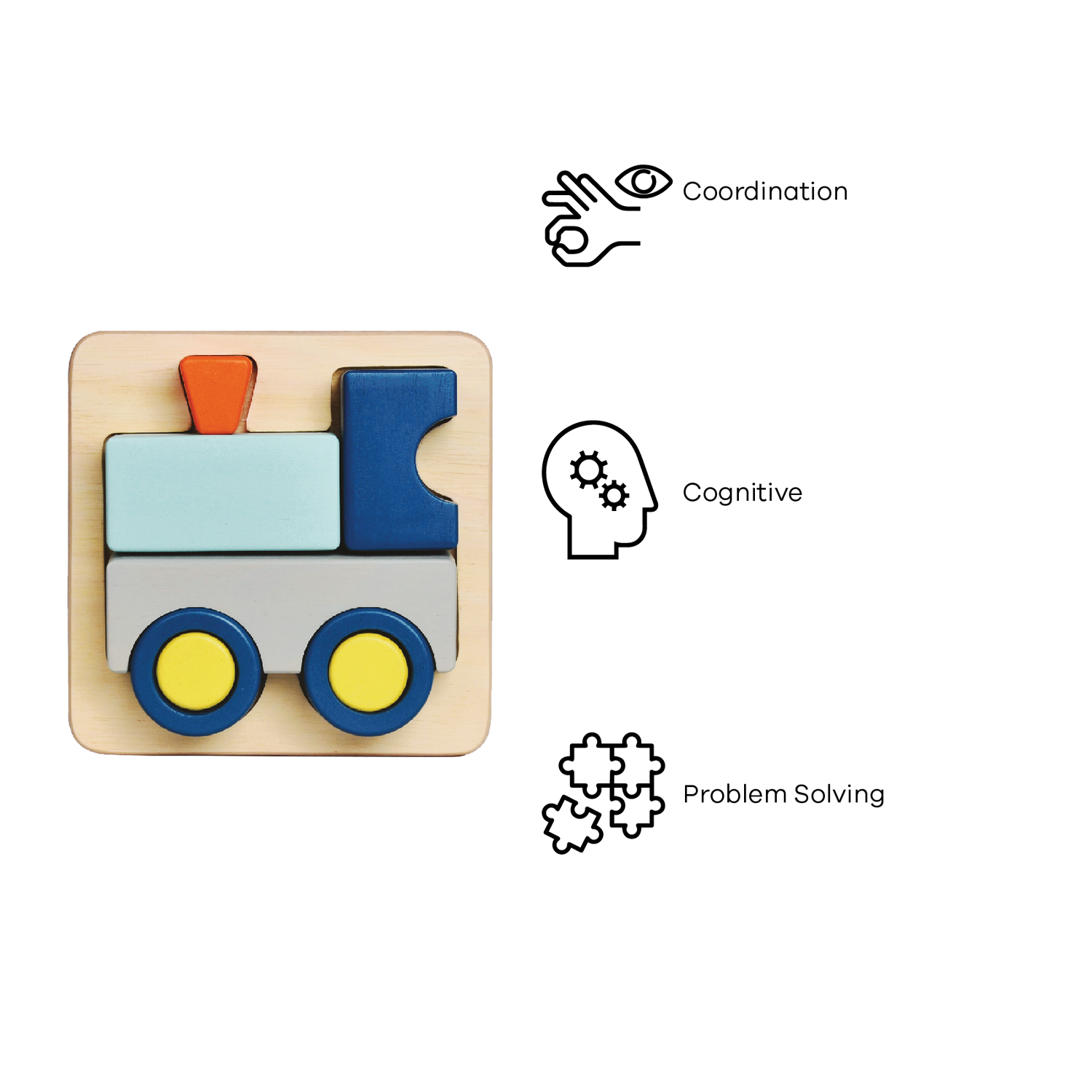 This Train Tray Puzzle contains large block pieces that are great for early child's eye-hand development. Putting the pieces back onto the tray to discover a train or use those pieces as building blocks to create other imaginative figures.