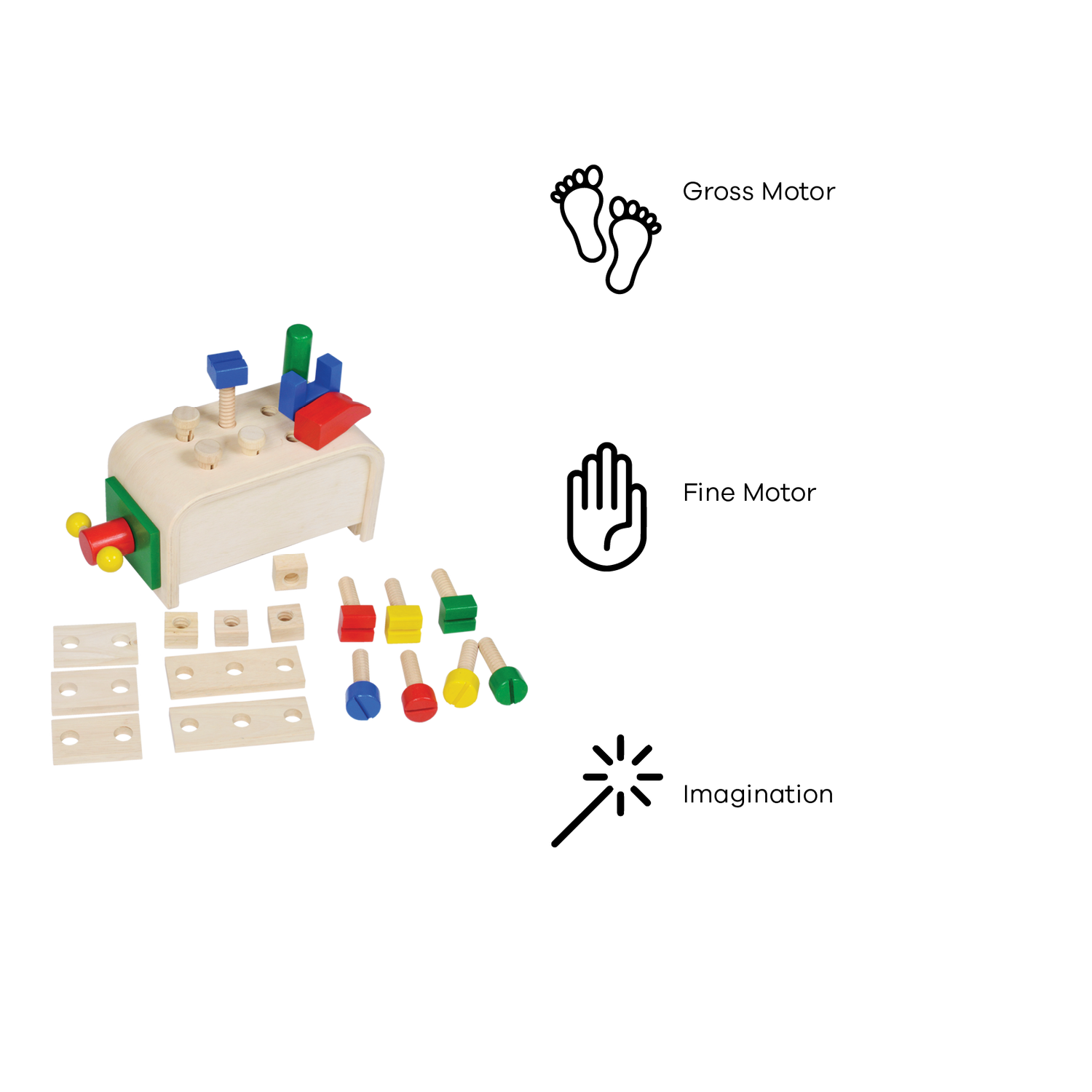 This durable carry around workbench comes completed with assorted tools, nails, nuts and screws, wooden girders, screw driver, wrench and vise. All tools are stored by flipping the workbench over using as tool storage box.