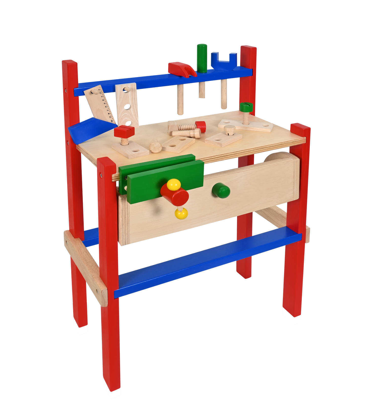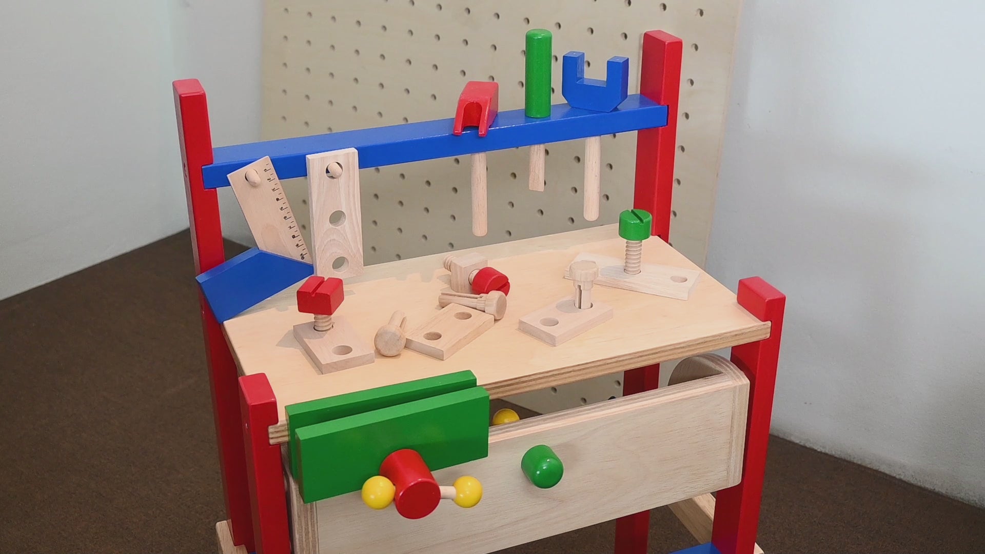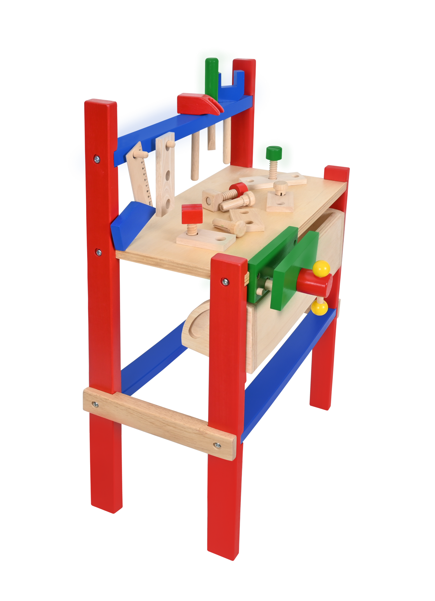 Colorful workbench equipped with vise, clamp, wrench, screwdriver, square rule, wooden girder, nuts and bolts, tool storage racks, and storage drawer.
